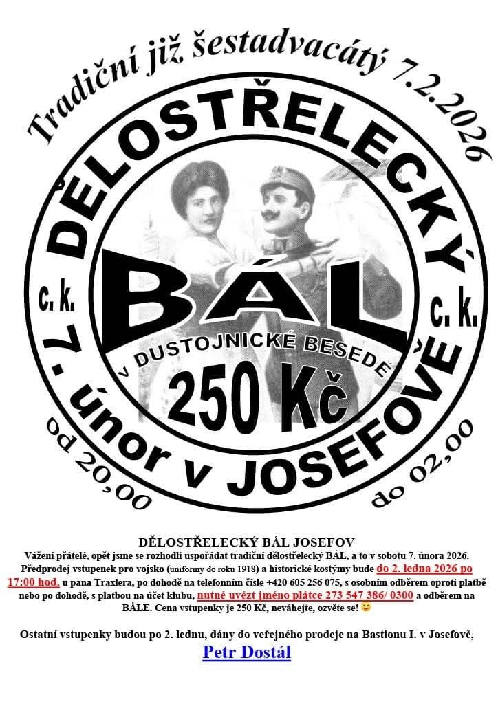 V sobotu 7. února 2026 se uskuteční tradiční dělostřelecký bál v Josefově. Předprodej vstupenek pro vojsko a historické kostýmy probíhá do 2. ledna 2026. Po tomto datu budou vstupenky dostupné veřejně na Bastionu I. v Josefově. Vstupenka pro vojsko a historické kostýmy je za cenu 250 Kč. Vyzýváme vás, abyste neváhali a zakoupili si vstupenku co nejdříve.