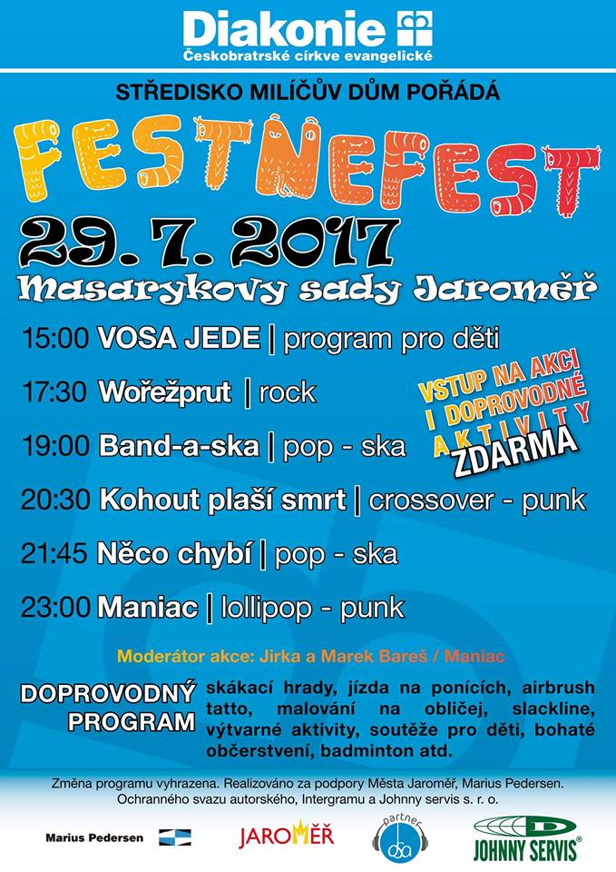 FestNeFefest bude zahájen ve 14:00 programem pro děti, jehož součástí bude jízda na ponících, skákací hrady, airbrush tatto, malování na obličej, slackline a trampolína. Pro nejmenší zde bude připravena dobrodružná Poťouchlíkova cesta, kde budou děti plnit úkoly za sladké odměny. V 15:00 vystoupí na pódiu umělecká agentura Vosa se svým pořadem plným písniček a soutěží VOSA JEDE. Program pro děti bude probíhat do 18:00.