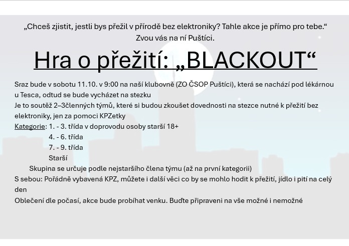Zveme vás na akci BLACKOUT, která se koná v sobotu 11. října 2025 od 9:00. Sraz bude v klubovně ZO ČSOP Puštíci, která se nachází pod lékárnou u Tesca. Hra je určena pro 2-3členné týmy, které si vyzkouší dovednosti potřebné k přežití v přírodě bez elektroniky. Soutěží se v několika kategoriích podle věku, přičemž skupina se určuje podle nejstaršího člena týmu. Nezapomeňte si přinést dobře vybavenou KPZ a další věci, které by se mohly hodit. Oblečení přizpůsobte počasí, akce probíhá venku, buďte připraveni na různé podmínky.