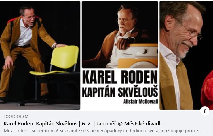 Dojemný příběh plný vnitřní síly, nadnášejícího humoru, ale i smutku a otázek o existenci je divadelním zážitkem na jedno zhltnutí. V oceňované hře Alistaira McDowalla se představí oblíbený herec Karel Roden, jenž se převleče do scvrknutého pláště a silou svého talentu se zmocní monologu sršícího invencí. Vydejte se s námi na jedinečnou jízdu životem, která nám připomene, že i ti neporazitelní nejsou imunní vůči tragédii.