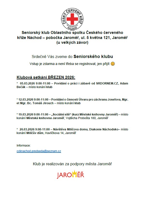 Zveme vás do Seniorského klubu Oblastního spolku Českého červeného kříže Náchod, pobočka Jaroměř.