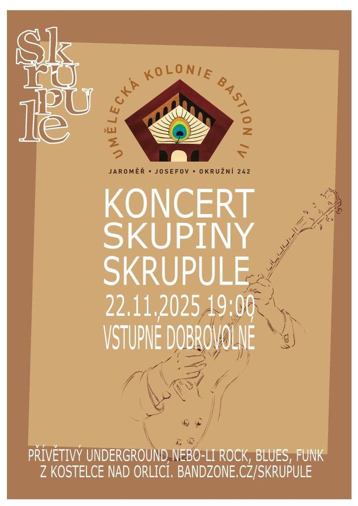 Srdečně vás zveme na koncert skupiny Skrupule, která se uskuteční 22. listopadu 2025 od 19:00. Tato kapela z Kostelce nad Orlicí se zaměřuje na žánry jako underground, rock, blues a funk. Přijďte si užít příjemnou atmosféru a skvělou hudbu. Vstupné je dobrovolné, takže můžete podpořit kapelu dle svých možností.