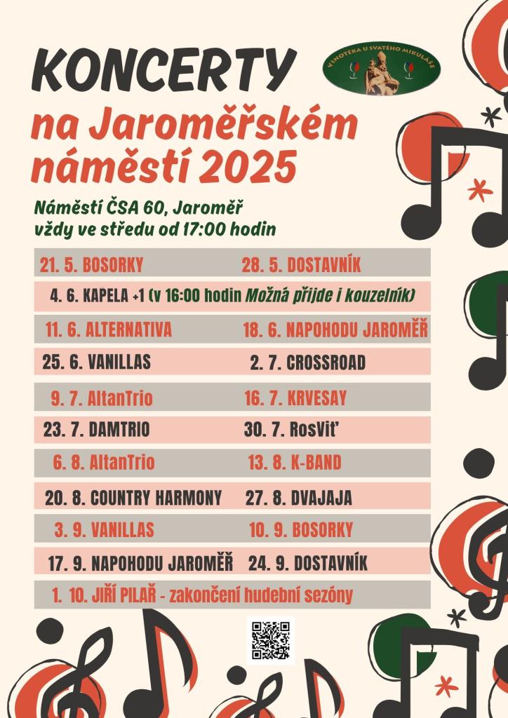 Na Jaroměřském náměstí se připravuje pestrá série koncertů, které začínají 30. dubna a potrvají až do 1. října. Vystoupí zde řada umělců, jako Jiří Pilař, K-BAND, Bosorky a další. Koncerty se konají pravidelně každou středu od 17:00 na velké podsíni před Vinotékou u sv. Mikuláše. Pro rezervace a další informace se obracejte na Vinotéku u sv. Mikuláše na náměstí ČSA 60, Jaroměř.