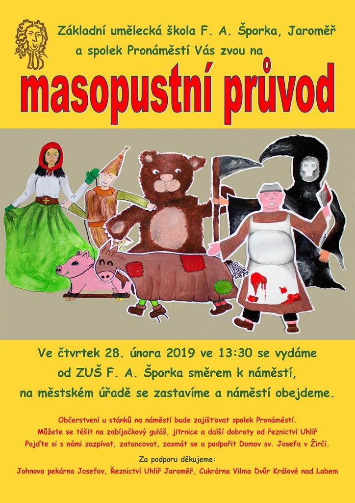 Ve čtvrtek 28. února 2019 se maškary a muzikanti v 13:30 od Základní umělecké školy F. A. Šporka směrem k městskému rynku budou ubírati, na Městském úřadě o Povolení a Feruli budou žádati a potom svými taškařicemi Vás budou chtít pobavit.