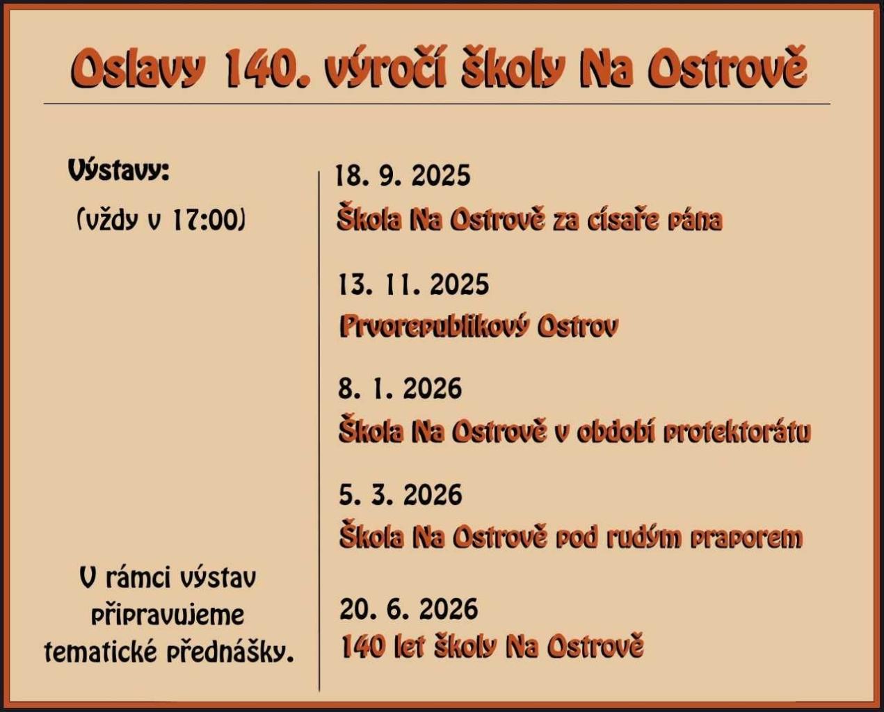 Škola Na Ostrově si vás dovoluje pozvat na oslavy svého 140. výročí. V rámci této příležitosti se uskuteční série tematických výstav a přednášek. Každá výstava začíná v 17:00. Těšíme se na vaši účast a sdílení vzpomínek na naši školu.