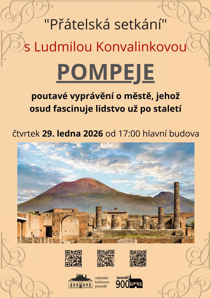 Zveme vás na poutavé vyprávění o Pompejích, fascinujícím městě, jehož osud nás zajímá už po staletí. Setkání se koná ve čtvrtek 29. ledna 2026 od 17:00 v hlavní budově městské knihovny v Jaroměři. Těšíme se na vaši účast, která obohatí diskuzi a přinese nové pohledy na tento historický fenomén.