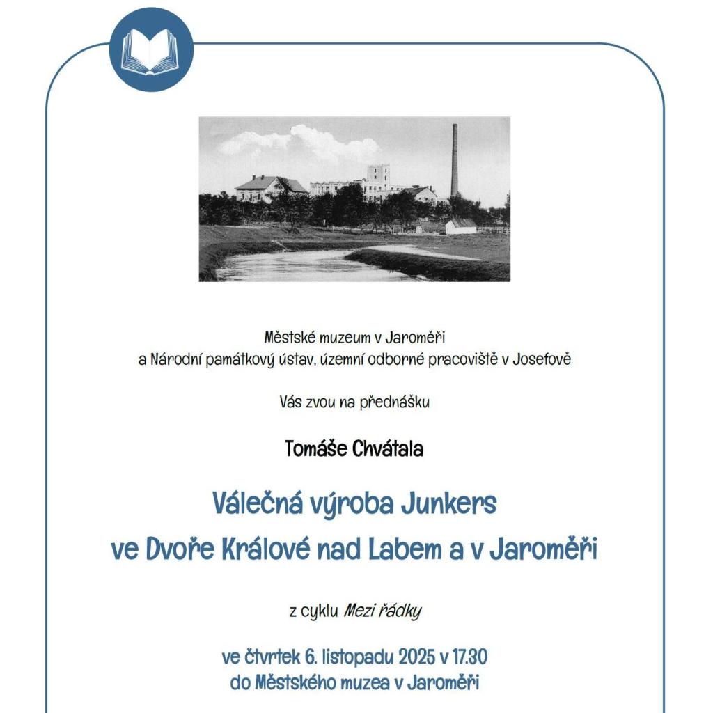 Městské muzeum v Jaroměři vás srdečně zve na přednášku Tomáše Chvátala, která se zaměří na válečnou výrobu společnosti Junkers ve Dvoře Králové nad Labem a v Jaroměři. Akce se koná ve čtvrtek 6. listopadu 2025 v 17:30 v prostorách muzea. Přijďte se dozvědět zajímavosti z historie a podívat se na související materiály.