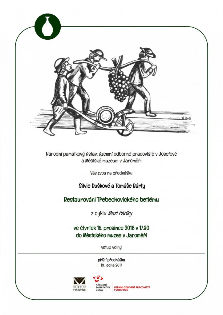 Příběh však ani poté nekončí. Naopak nabývá na dramatičnosti. Po smrti Probošta nechybělo mnoho, aby skončil na smetišti. Nejobdivovanější český betlém byl v roce 1999 prohlášen Národní kulturní památkou. V letech 2015 - 2016 prošel náročným restaurátorským procesem. Nejen o průběhu jeho obnovy, ale i o složité přípravě a získání potřebné dotace bude ve čtvrtek 15. prosince vyprávět paní Mgr. Silvie Dušková, ředitelka Třebechovického muzea betlémů, rodačka z Jaroměře.