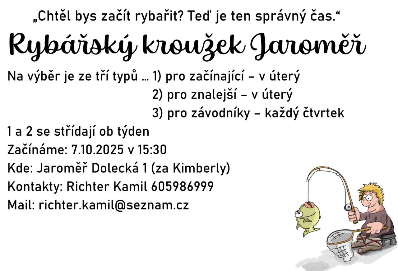 Chtěli byste začít rybařit? Teď je ten správný čas! Na výběr máme tři typy kurzů: pro začínající rybáře a pro pokročilé, které se konají každé úterý, a pro závodníky, kteří se mohou připojit každý čtvrtek. Kurzy pro začátečníky a pokročilé se střídají ob týden. První kurz začíná 7. října 2025 v 15:30 na adrese Jaroměř Dolecká 1, za Kimberly. Pro více informací kontaktujte Kamila Richtera na telefonu 605986999 nebo na e-mail richter.kamil@seznam.cz.