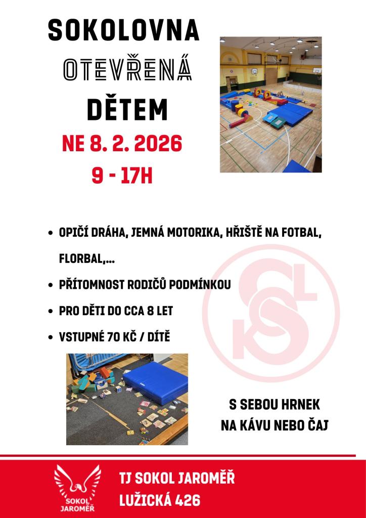 Otevřená sokolovna je určena pro děti do cca 8 let a proběhne v neděli 8. února 2026 od 9:00 do 17:00 hodin. Děti se mohou těšit na opičí dráhu, jemnou motoriku a hřiště na fotbal a florbal. Rodičovská přítomnost je podmínkou. Nezapomeňte si vzít hrnek na kávu nebo čaj.
