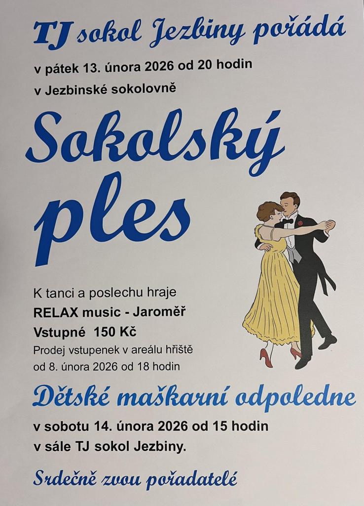 V pátek 13. února 2026 od 20 hodin se v Jezbinské sokolovně uskuteční Sokolský ples, na který vás srdečně zvou pořadatelé z TJ Sokol Jezbiny. K tanci a poslechu zahraje kapela RELAX music z Jaroměře. Vstupné je 150 Kč a vstupenky bude možné zakoupit v areálu hřiště od 8. února 2026 od 18 hodin.