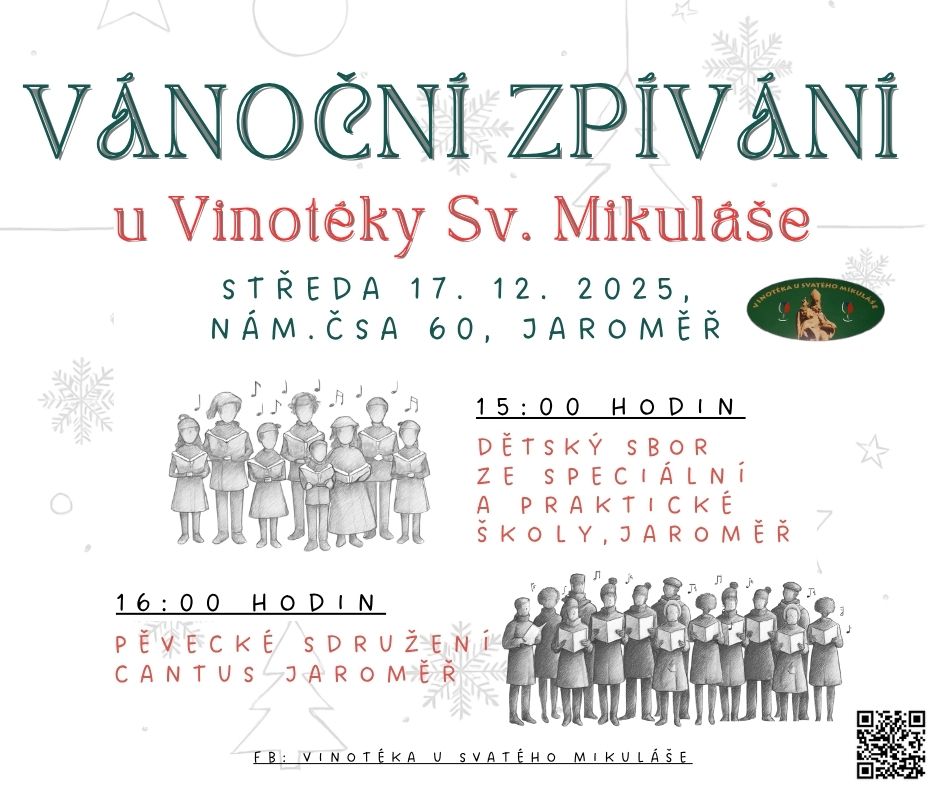 Zveme vás na vánoční zpívání u Vinotéky Sv. Mikuláše, které se koná dne 17. prosince 2025. V programu vystoupí dětský sbor ze Speciální a praktické školy a pěvecké sdružení Cantus Jaroměř. Přijďte si užít vánoční atmosféru a poslechnout si krásné koledy v příjemném prostředí.
