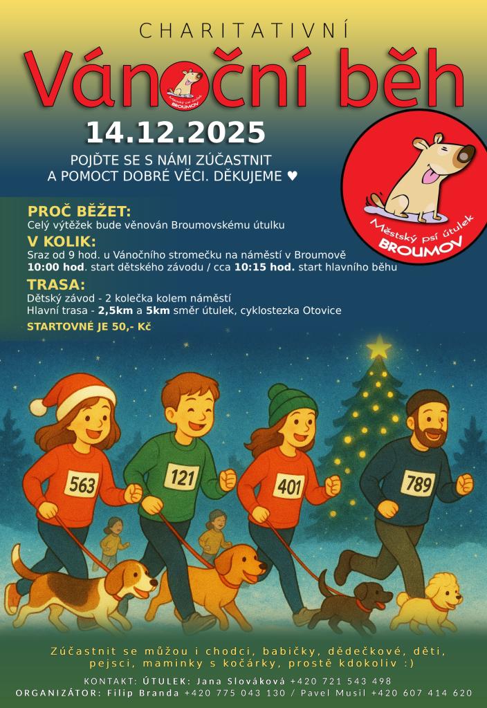 Zveme vás na charitativní běh, jehož cílem je podpořit Broumovský útulek. Akce se koná 14.12.2025, sraz je od 9:00 hod. u Vánočního stromečku na náměstí v Broumově. Dětský závod startuje v 10:00 hod., hlavní běh následně v 10:15 hod. Trasa pro děti zahrnuje dvě kolečka kolem náměstí, zatímco hlavní