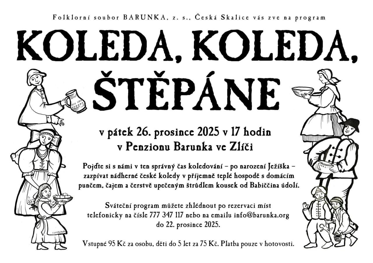 Přijďte si zazpívat české koledy.  Můžete se těšit na lidovou vánoční hru s dřevěnými figurkami betléma a na hru Na Jesličky. Tato akce je skvělou příležitostí pro rodiny a přátele, aby společně prožili kouzlo Vánoc a obdivovali krásu tradičních koled.