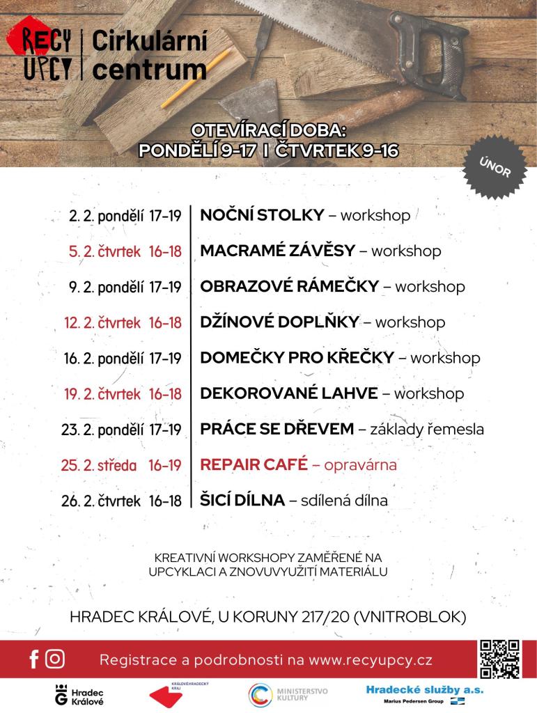 Přijďte si užít sérii kreativních workshopů, které se konají v Hradci Králové. Na programu jsou různé aktivity jako vytváření nočních stolků, macramé závěsů, obrazových rámečků, džínových doplňků a domečků pro křečky. Také se naučíte dekorovat lahve a seznámíte se se základy práce se dřevem. Nezapomeňte si vyzkoušet šicí dílnu a zjistit, jak upcyklovat a znovu využít materiály.