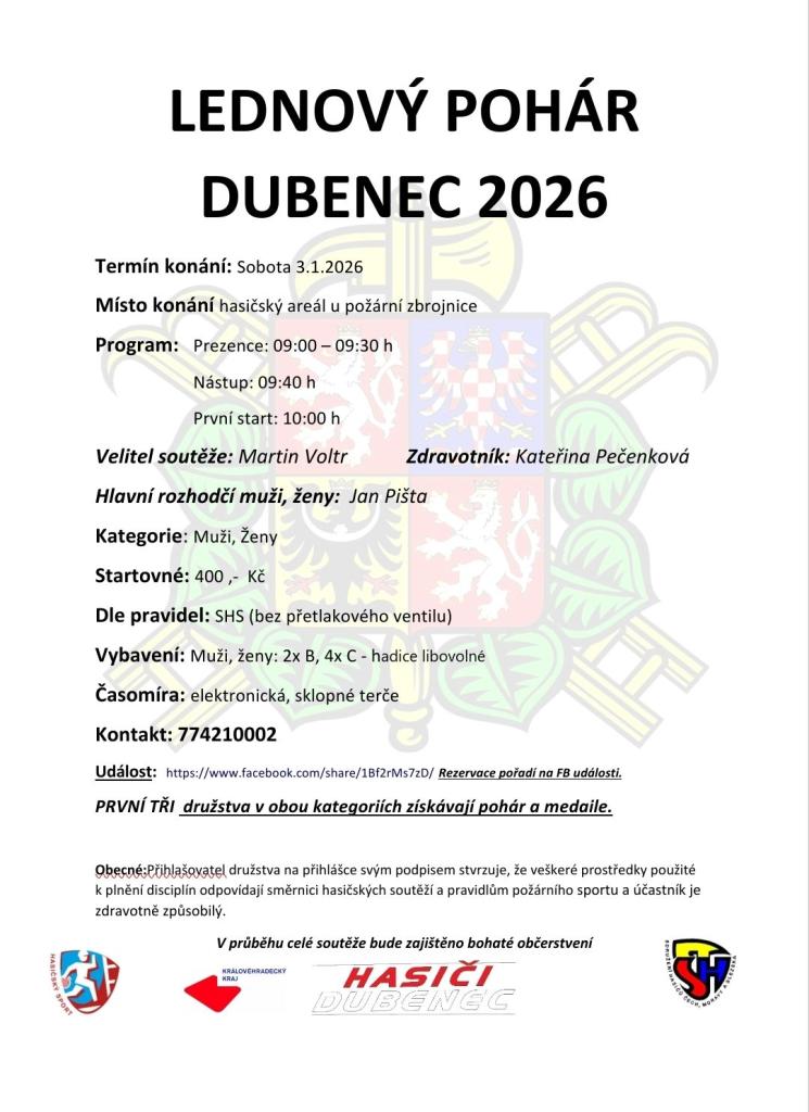 Lednový pohár 2026 proběhne v sobotu 3. ledna 2026 v hasičském areálu u požární zbrojnice. Prezence soutěžících je naplánována od 09:00 do 09:30. Po úvodním nástupu v 09:40 se první start uskuteční v 10:00. Soutěž zahrnuje kategorie Muži a Ženy, kde se očekává účast různých družstev. Startovné činí