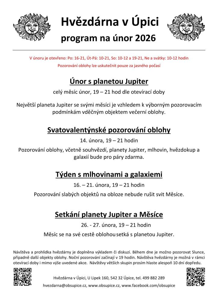 Hvězdárna v Úpici nabízí v únoru 2026 řadu pozorovacích akcí. V rámci otevírací doby se můžete zapojit do večerního pozorování oblohy, kde bude k vidění planeta Jupiter a další objekty. Pozorování probíhá za jasného počasí a je přístupné pro všechny zájemce. Dále se můžete zúčastnit speciálních akcí jako Svatovalentýnské pozorování a Týden s mlhovinami a galaxiemi.