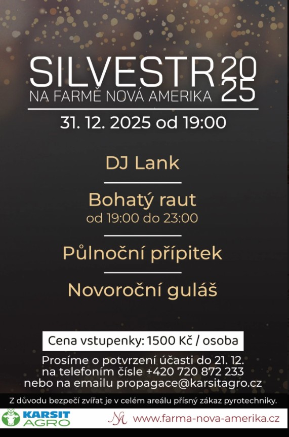 Zveme vás na Silvestr na farmě Nová Amerika, který se koná 31. 12. 2025 od 19:00. Přijďte si užít večer s DJ Lankem, bohatým rautem a novoročním gulášem. Těšit se můžete na půlnoční přípitek. Cena vstupenky je 1500 Kč na osobu. Prosíme o potvrzení účasti do 21. 12. na uvedený kontakt.