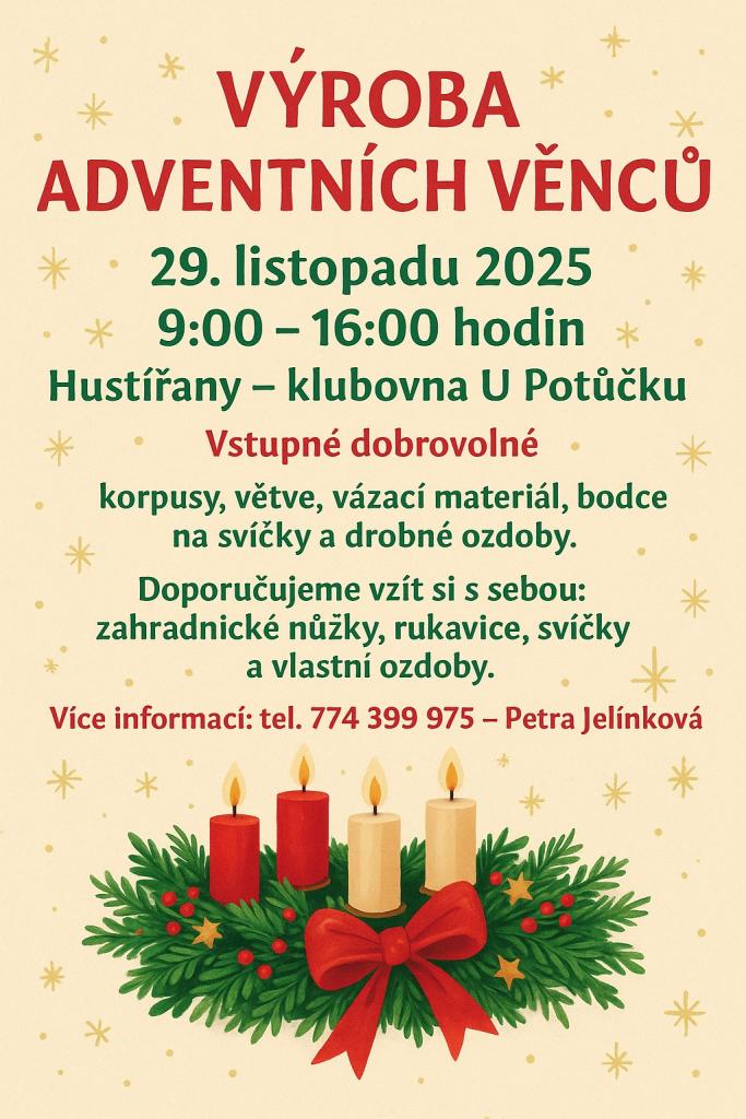 Přijďte si vyrobit vlastní adventní věnec v klubovně U Potůčku v Hustířanech. Akce probíhá 29. listopadu 2025 od 9:00 do 16:00 hodin. Na místě budou k dispozici korpusy, větve, vázací materiál, bodce na svíčky a drobné ozdoby. Doporučujeme vzít si s sebou zahradnické nůžky, rukavice, svíčky a vlastní ozdoby, abyste si vytvořili jedinečný kousek. Těšíme se na vaši účast.
