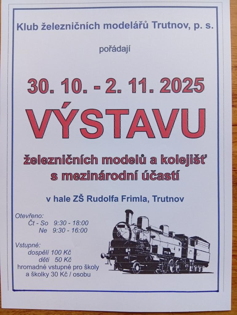 Klub železničních modelářů Trutnov pořádá výstavu železničních modelů a kolejišť s mezinárodní účastí. Akce se koná od 30. října do 2. listopadu 2025 v hale ZŠ Rudolfa Frimla v Trutnově. Návštěvníci se mohou těšit na pestrou nabídku modelů a kolejišť, které zaujmou jak odborníky, tak širokou veřejnost. Otevřeno bude od čtvrtka do soboty od 9:30 do 18:00 a v neděli od 9:30 do 16:00. Vstupné je stanovené na 100 Kč pro dospělé a 50 Kč pro mladé návštěvníky.